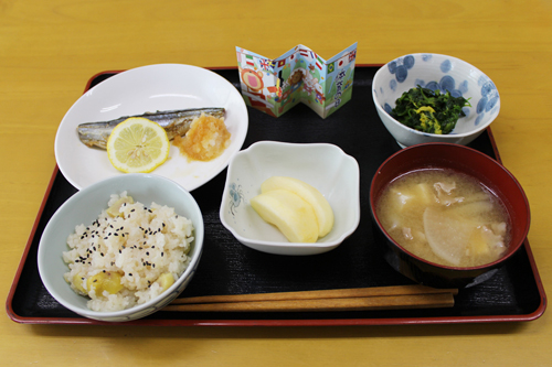 昼食例:栗ごはん・さんまの塩焼き・青菜のお浸し・りんご・豚汁